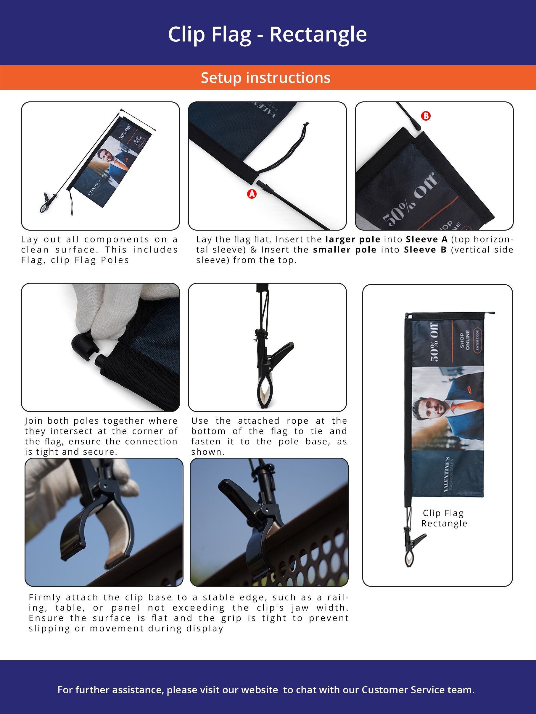 I used these clip flags at a recent outdoor event, and they were a hit. The fabric is sturdy, and the printing is sharp and clear. They were easy to assemble and stood out beautifully, even from a distance. Highly recommend for anyone needing portable and effective signage.