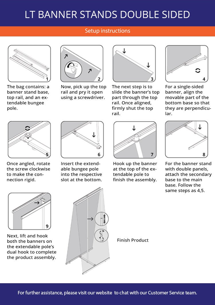Assembly was a little more cumbersome and time consuming compared to similar products, but we found this to be good value for a double-sided banner. Excellent shipping times - product arrived ahead of advertised delivery date.