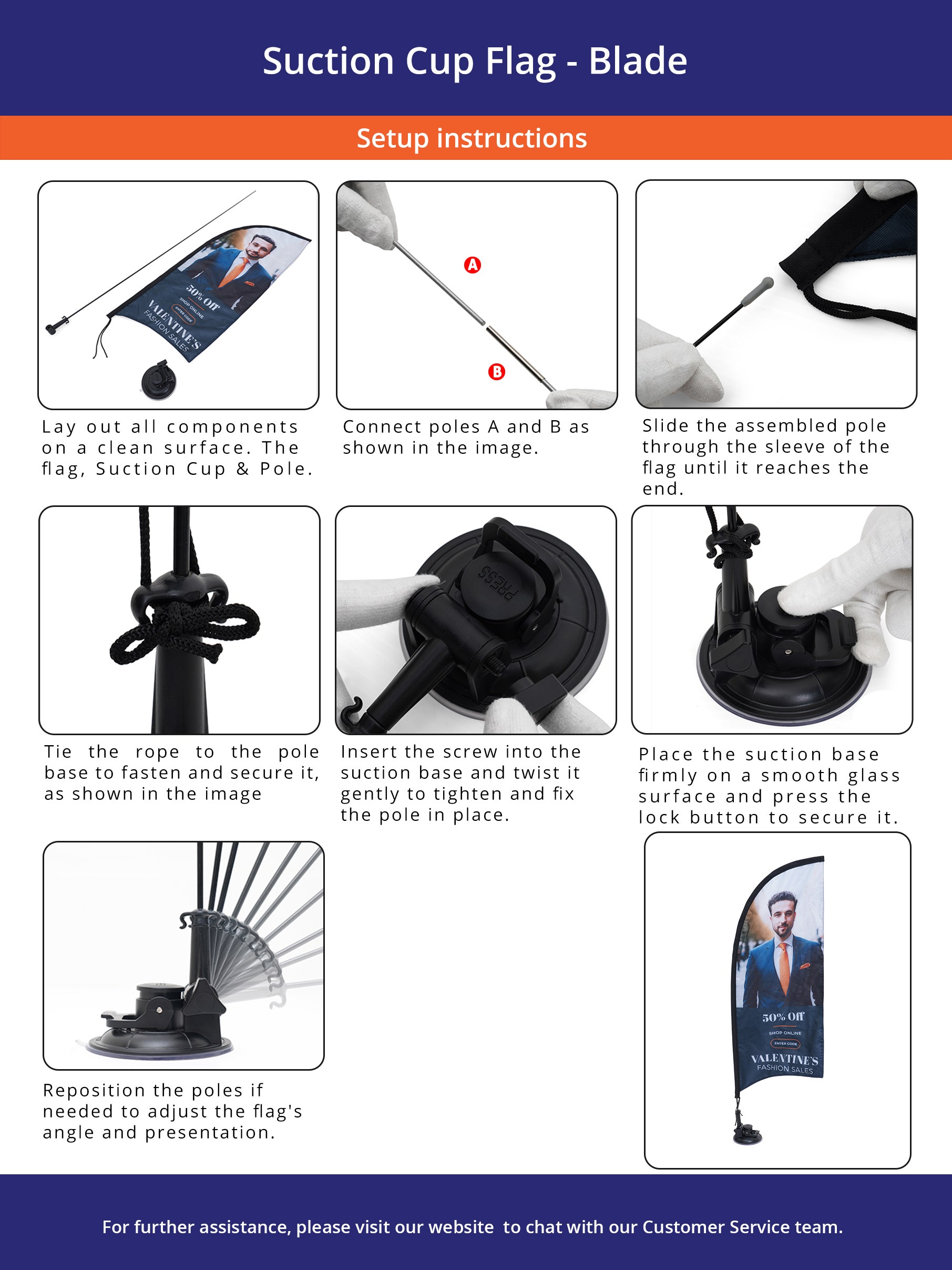 Our blade suction cup flags are constructed from 2.6 oz knitted polyester fabric, which balances durability with outstanding display quality. The carbon composite fiber pole and plastic clip included with each flag ensure a secure and stable display. We use sublimation printing method to create sharp and high-resolution images that stay dynamic and resist fading. Keeping your message vibrant in various weather conditions.