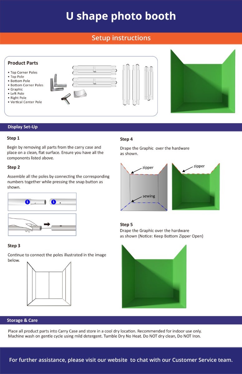 After hosting what’s sure to be an unforgettable event, the last thing you want is hassle-filled cleanup. Our photo booths for sale come with straightforward graphic care instructions to keep things simple yet efficient. Choose between regular machine wash or hand wash using mild detergent - this fabric maintains its allure without demanding extra effort on your part. For drying? Lay flat for pristine results or opt for drip-drying or tumbling on the gentlest setting if time presses on you. Get our U Shape Photo Booth Enclosure for Immersive Experience in photography.